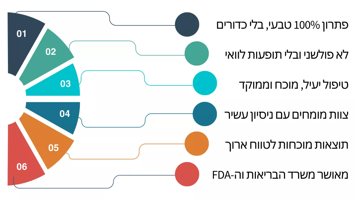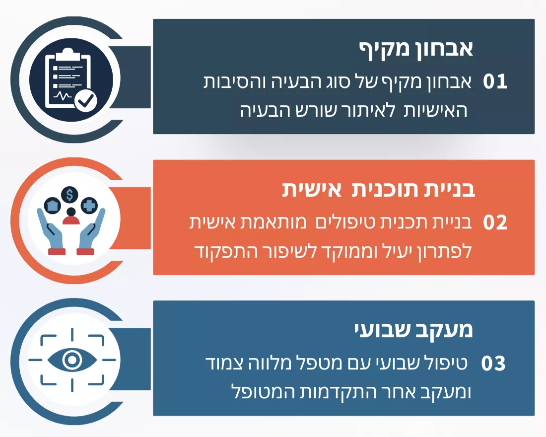 מרפאתנו היחידה בישראל שמעניקה ללקוחותיה טיפול בהתאמה אישית לפתרון שורש הבעיה, בהתאם לפרופיל האישי והרפואי של המטופל שמתבסס על שיטות טיפול מתקדמות ומוכחות: