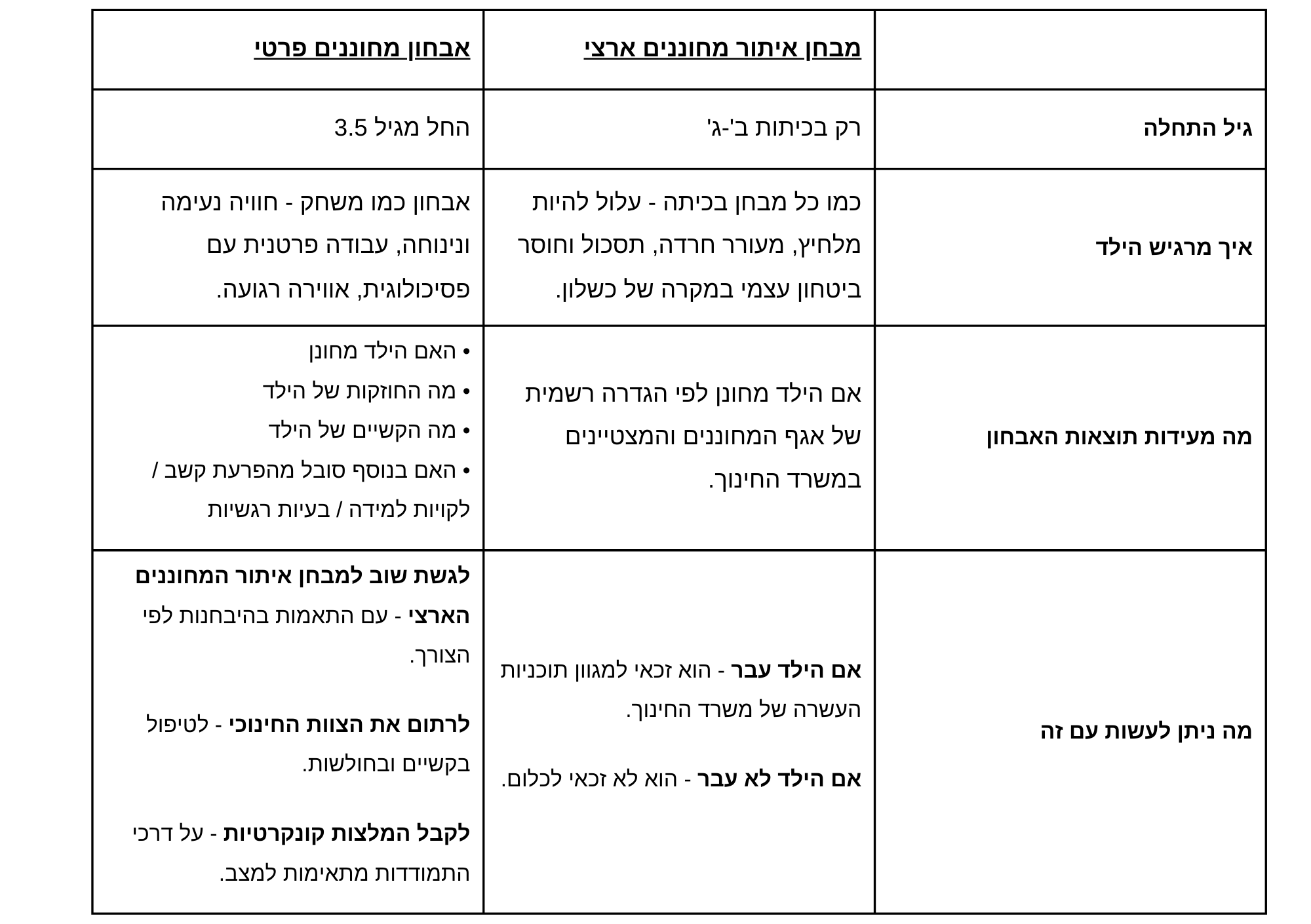אולם ההמלצה היא בכל מקרה לעבור אבחון פרטני כדי לדאוג להתאמות האלו לפני המבחן, וכך להימנע מתסכול וכשלון וליצור אצל הילד תחושת הצלחה ומסוגלות כבר במבחן הראשוני.