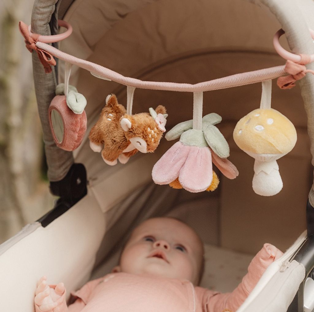 גם זמן בעגלה הוא הזדמנות ללמידה. שרשרת לעגלה מעודדת תיאום עין-יד וסקרנות גם בזמן טיול. חפץ מוכר מחוץ לבית מעניק תחושת ביטחון – תנאי חשוב להתפתחות תקינה.