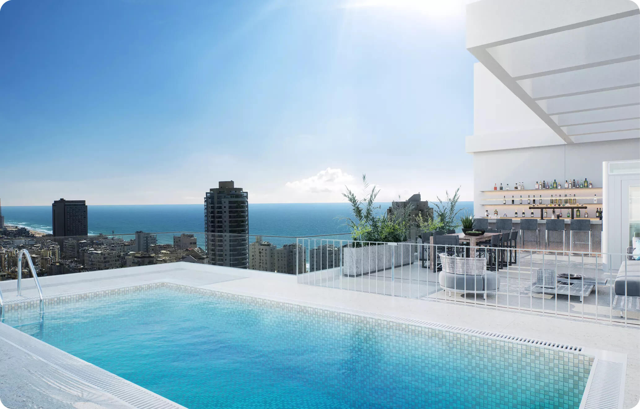 בנוסף, דיירי המגדל יהנו מ-6 מפלסי מרתפים וחניה תת קרקעיים, מעליות מהירות, מועדון כושר פרטי, פיתוח סביבה בתכנון מעצב נוף – בסטנדרטים האיכותיים ביותר. הכל בהתאם לתפישת המגורים המשלבת נוף של ים עם יוקרה בלתי מתפשרת.
