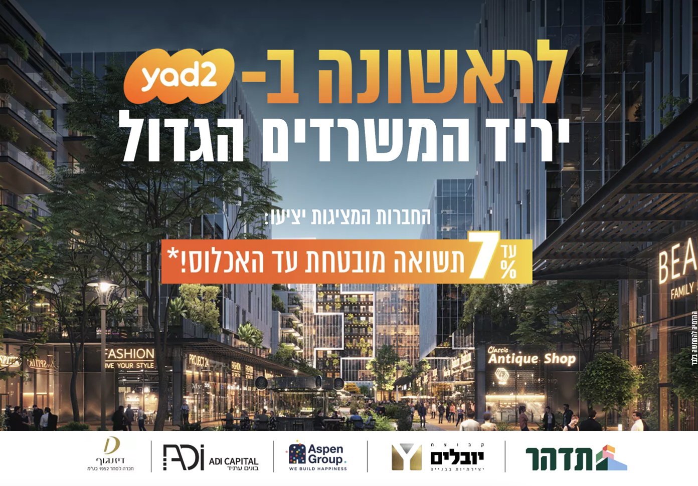 אם אתם מחפשים הזדמנות חד-פעמית להשקיע במשרדים המבוקשים ביותר בישראל, אנחנו מזמינים אתכם ליריד המשרדים הגדול שיתקיים בתאריכים 20-21 בפברואר במשרדי יד2. זהו אירוע שאסור לפספס לכל מי שמחפש הזדמנויות ייחודיות לרכישה או השקעה בתחום הנדל”ן המסחרי.